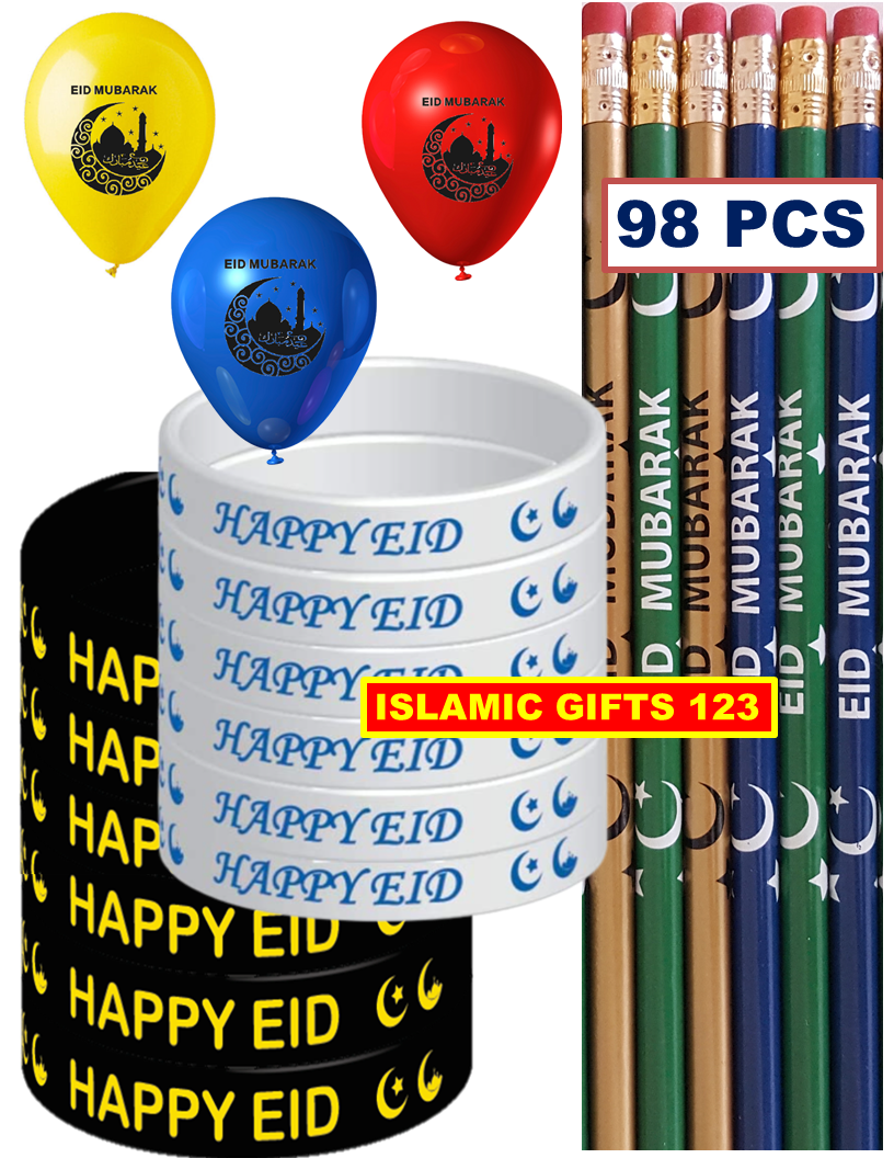 - 12 High quality Eid wristbands in youth size. “EID MUBARAK, HAPPY EID” printed on silicon bracelet, with Islamic artwork all around.