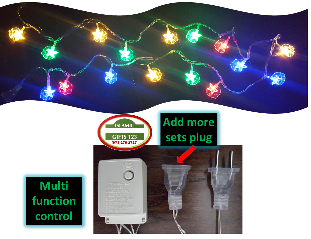- Plug can be connected to other lights to add more sets. Multiple functions on controller, including steady on and chasing lights.