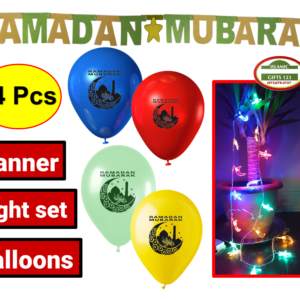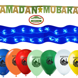 Create a festive atmosphere for Ramadan with our Ramadan Mubarak Gold Banner & Balloon Set. This high-quality decoration kit features individually inflated gold letters spelling “RAMADAN MUBARAK,” along with 10 colorful latex balloons printed with “Ramadan Mubarak” in both English and Arabic. Perfect for home décor, Iftar gatherings, and Ramadan events, this set adds an elegant and celebratory touch to any space.